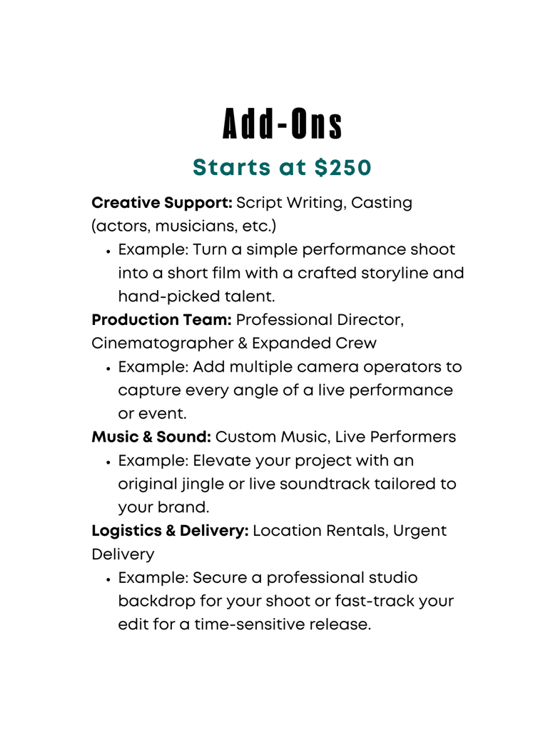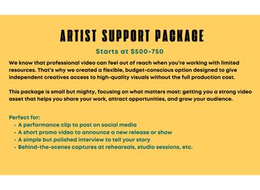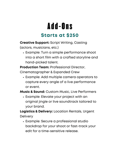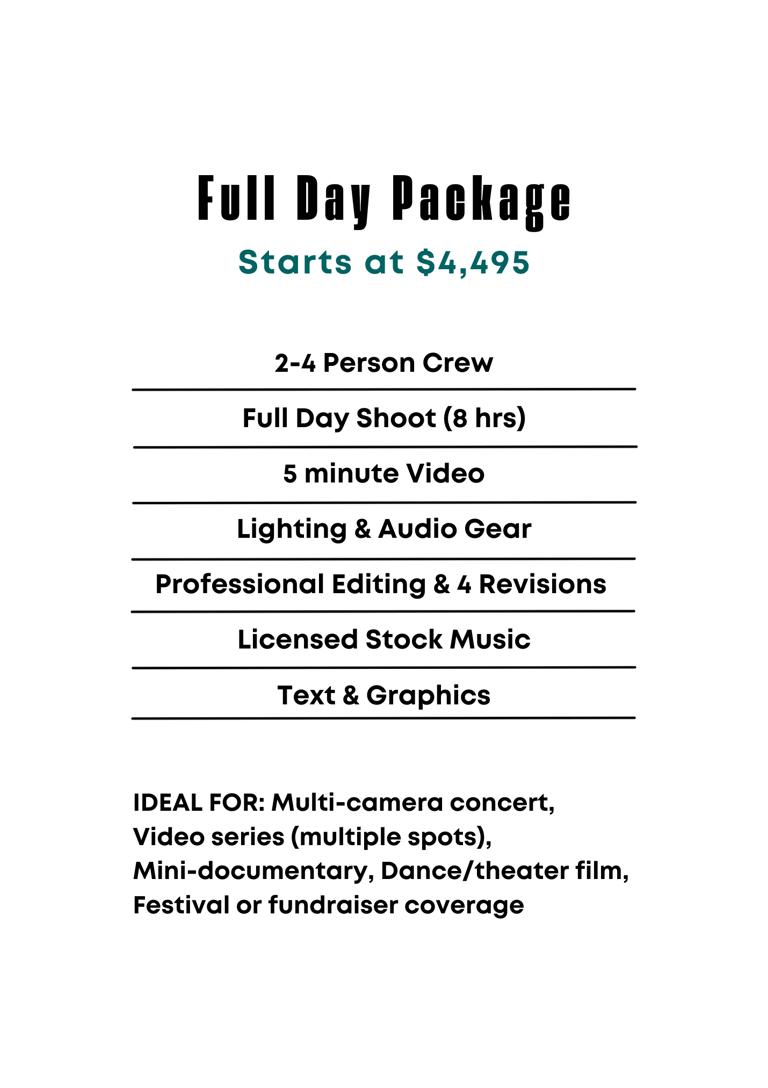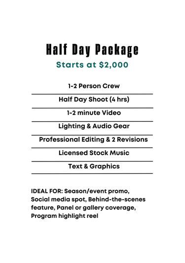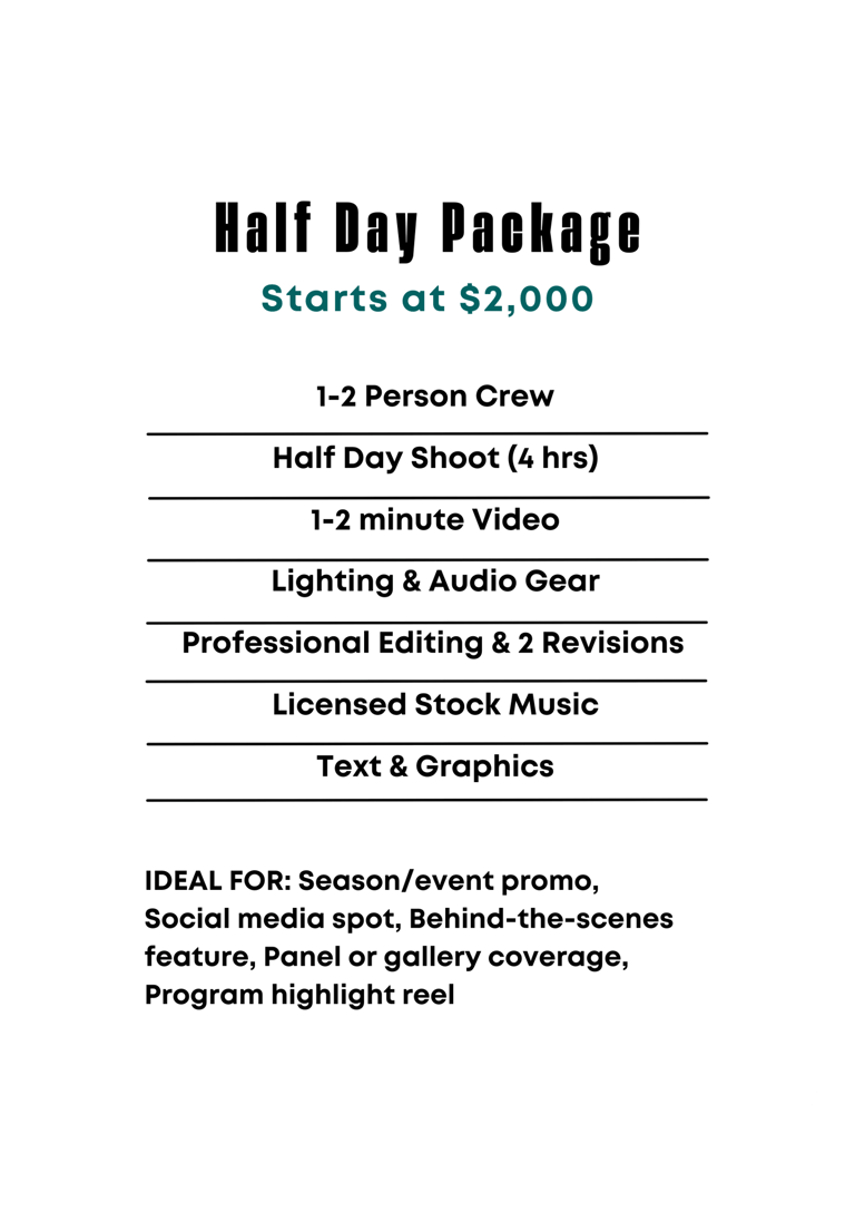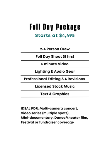 We take the time to understand your needs and budget on the front end and will never recommend resources that feel excessive. Every package includes hands-on client support and project management to keep your production smooth from start to finish. The options below are simply a starting point-- a framework to help us find the best path toward your project’s success.