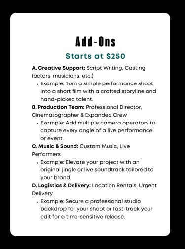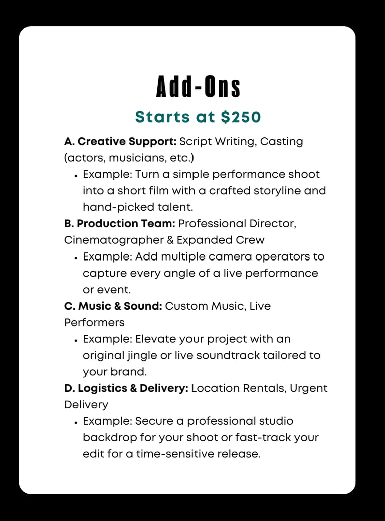 Whether you represent an arts organization or are an independent creative, our priority is to deliver polished, professional videos that elevate your story without compromising your voice. With us, you can trust that your project is handled with care, expertise, and a commitment to excellence.